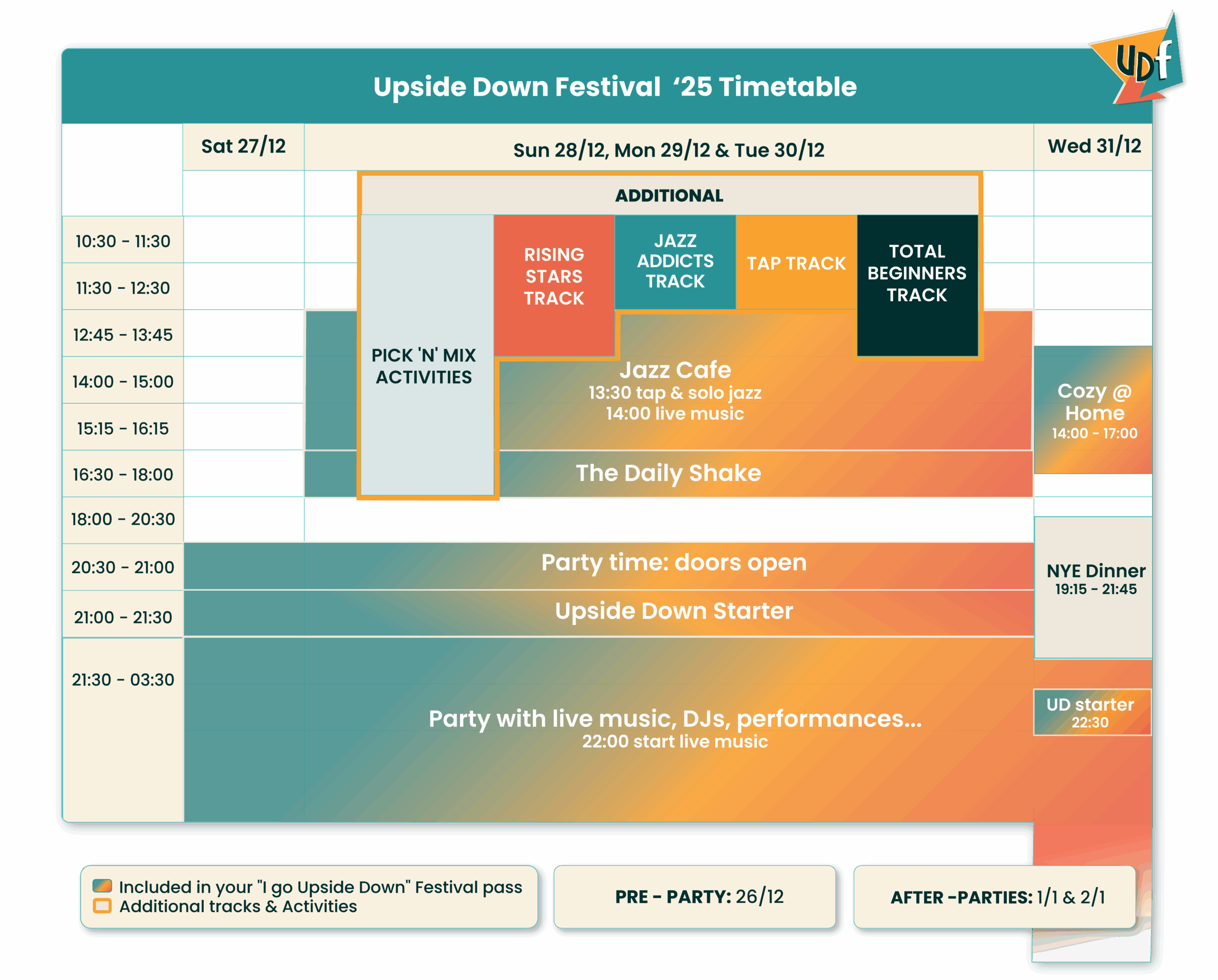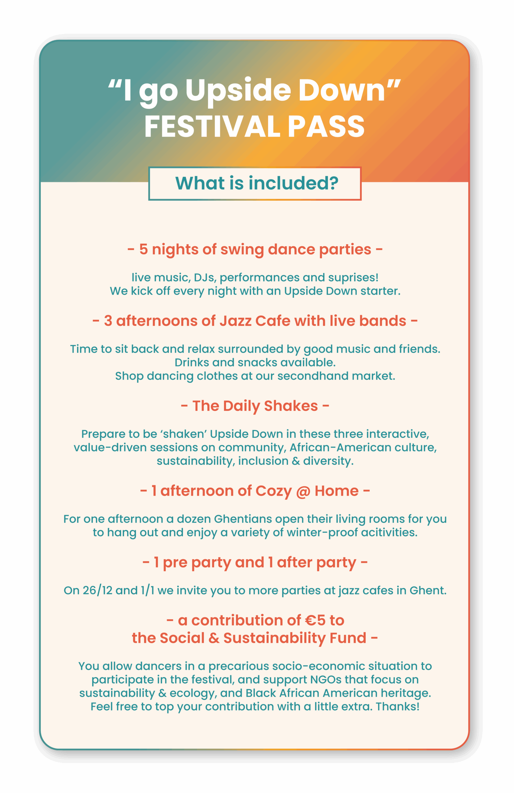 SPECIAL UPDATE! New this year is the 4-day pass, which includes all activities of the festival pass, except the 31st (so no Cozy @ Home and NYE party). This pass is ideal for people who have other plans on the last day of the year.