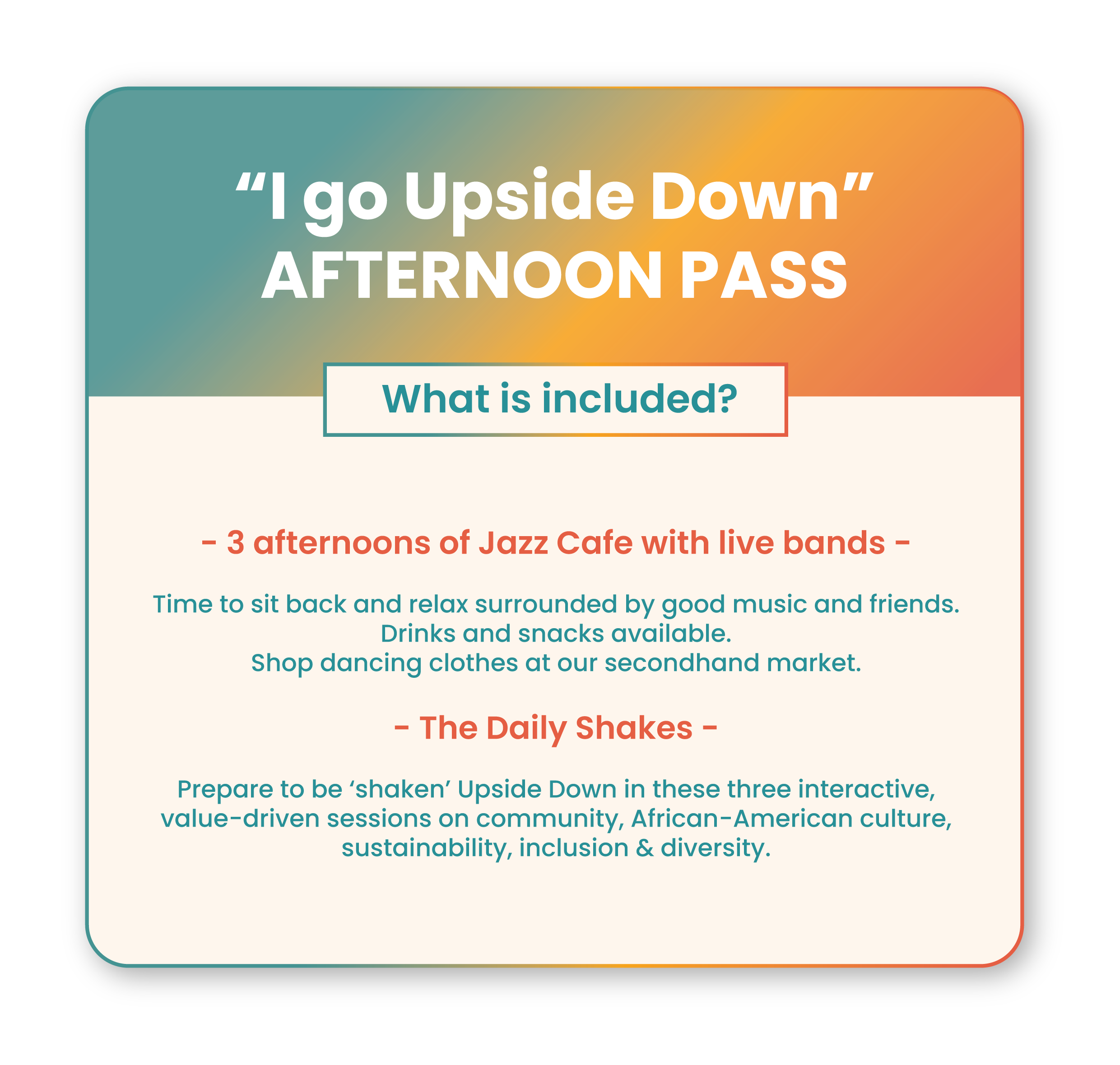 Thought-provoking talks on the values that are at the heart of Upside Down festival: Inclusivity, respect for Black culture and Sustainability.